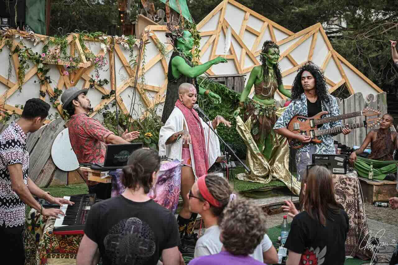 We give concerts at festivals, private events and parties using a wide range of genres like shamanic jazz, funk, world electro swing, indian classical, and psychedelic ethnic fusion